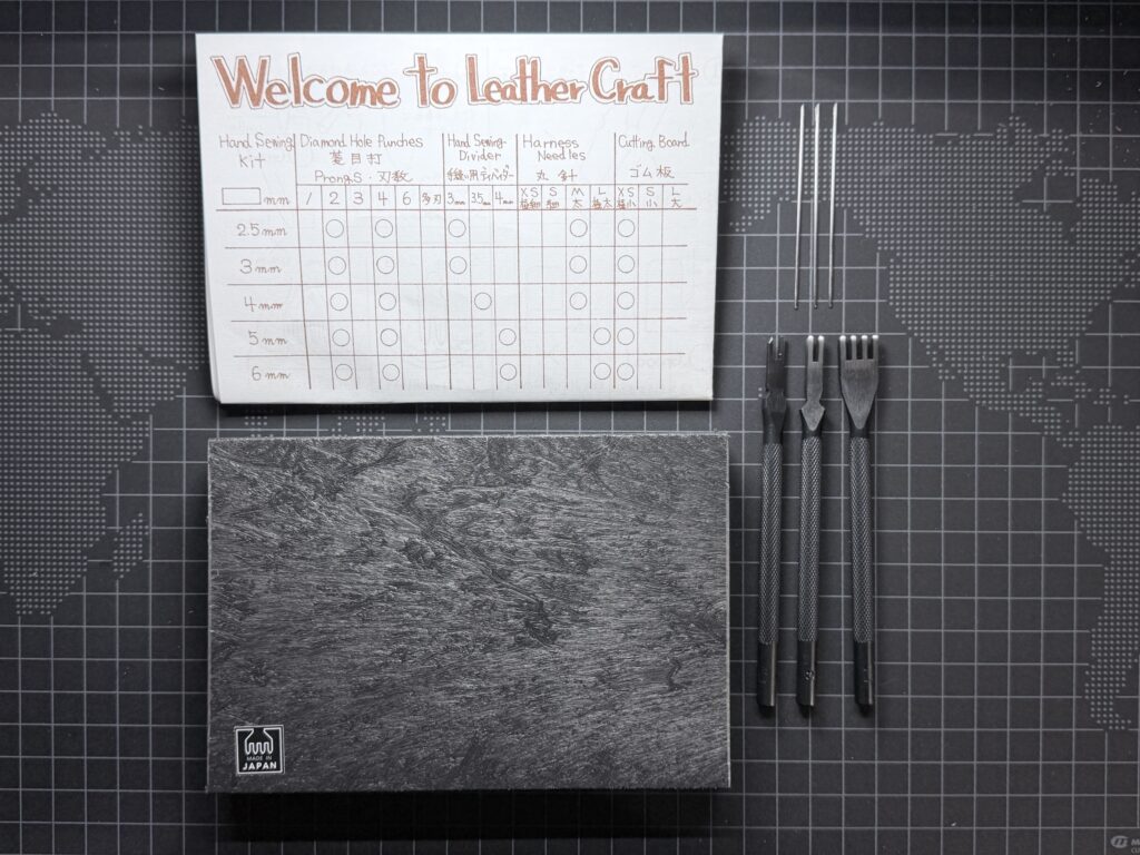 取扱説明書、ゴム板、菱目打、手縫い用ディバイダー、手縫い用針がセットになったもの。