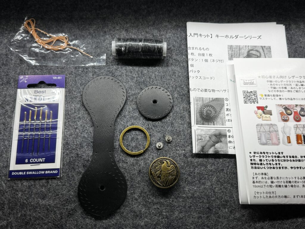 中に入っていたのは、穴あけ済みの革パーツ、蝋引き糸、針、コンチョボタン類。